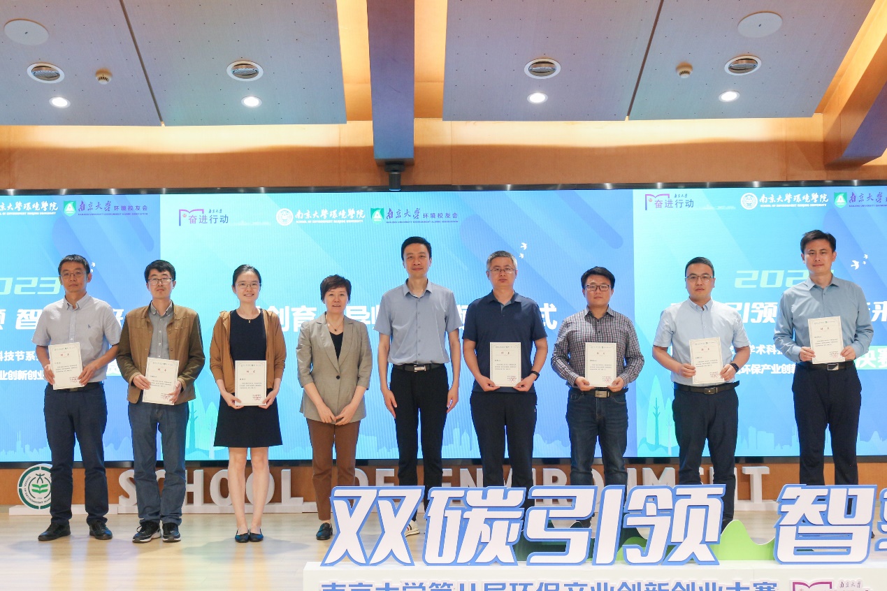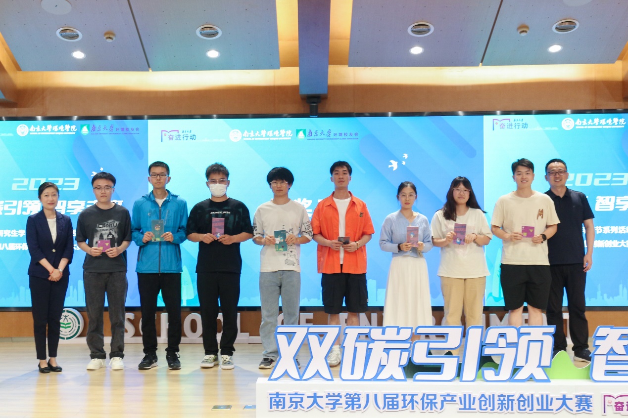 刘建萍、陆朝阳以及中持水务股份有限公司工程技术中心副主任黄滨辉、高科环境科技有限公司副总经理苏忆波、党委研工部副部长李宁、创新创业与成果转化办公室副主任周剑锋、团委副书记郭明姬、学院教授叶林分别为获奖团队颁奖。此外,北控水务集团有限公司教育中心副总经理冀广鹏在线上担任本届大赛评委。
