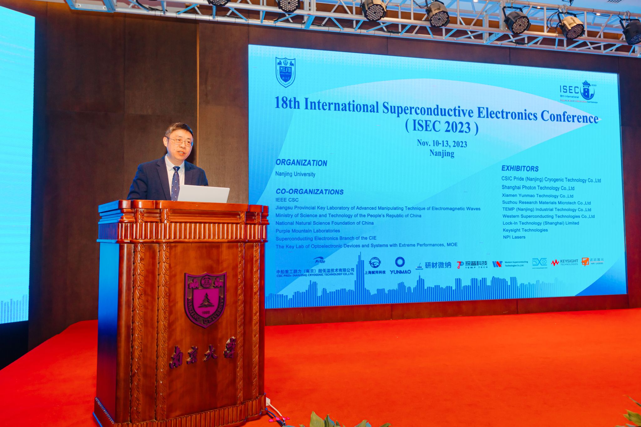 初冬微寒,凯发k8官网国际会议中心宾朋集聚、气氛融洽。为进一步推动全球超导电子器件及相关领域的研究与学术交流,让世界范围内的学者深切感受学术界的最新发展动态,第18届国际超导电子学会议(The 18th International Superconductive Electronics Conference,ISEC2023)于11月10日至13日在凯发k8官网举办。凯发k8官网副校长陆延青教授出席开幕式并致辞。开幕式由本届程序委员会主席、凯发k8官网陈健教授主持。