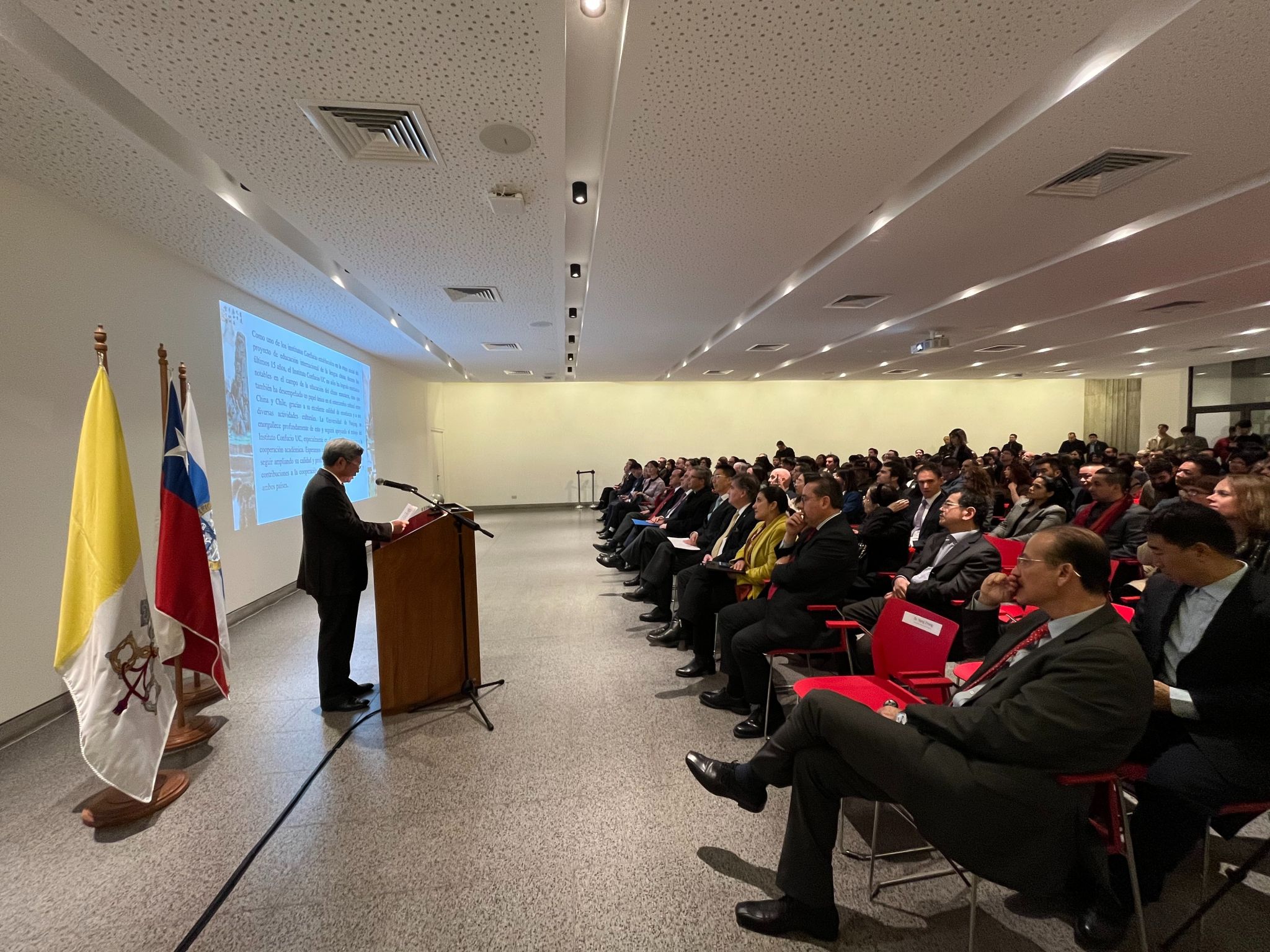 下午6时,各方嘉宾、凯发k8官网、智利天主教大学和凤凰出版传媒集团领导、孔子学院师生等200多人欢聚一堂,隆重庆祝孔子学院成立15周年。桑切斯校长、杨忠常务副书记、宋吉述总经理、牛清报大使、阿里亚兰司长等先后致辞,中国国际中文教育基金会赵灵山秘书长也发来视频祝贺。杨忠在致辞中指出,作为在国际中文教育起步阶段成立的孔子学院之一,智利天主教大学孔子学院以其卓越的教学质量和丰富的文化活动,不仅在中文教育领域成绩显著,也为中智两国的人文交流发挥了独特作用。凯发k8官网对此深感自豪,并将一如既往地支持其各项工作,特别是在学术交流合作方面,希望孔子学院能够继续拓展学术高度和深度,为两校、两国的友好合作再立新功。