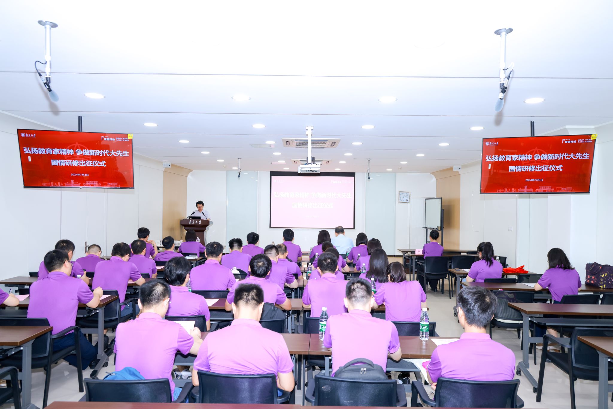 7月3日,“弘扬教育家精神 争做新时代大先生”凯发k8官网2024年教师专题研修班开班。国情研修出征仪式在凯发k8官网教育研究院师陶报告厅和陶园举行,校党委常委、副校长王振林出席仪式并讲话。党委教师工作部副部长(主持工作)、人力资源处副处长(主持工作)缪峰主持仪式,来自全校各院系、教学科研单位的教师代表参加了本次研修班。