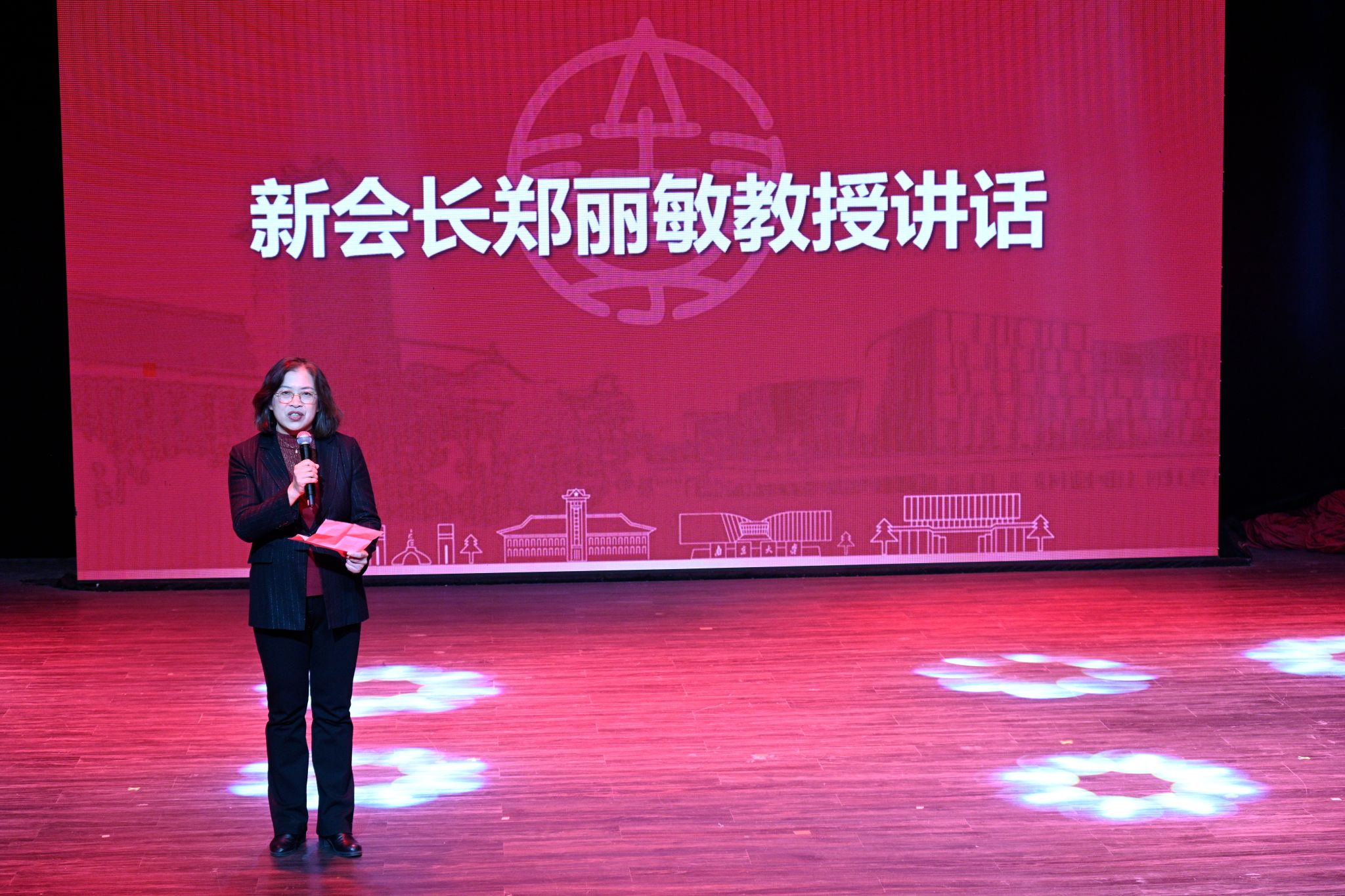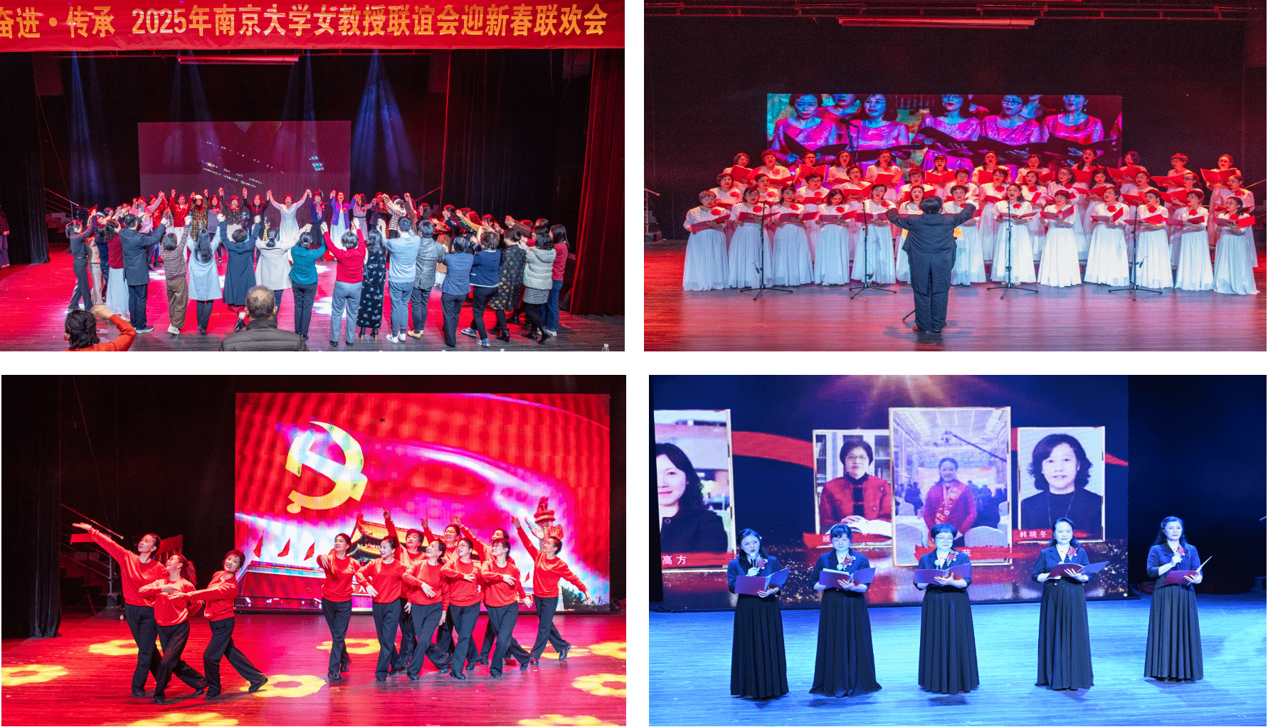 之后,女教授们带来了一系列精彩的节目,展示了科研之外别样的风采。在《姐妹们手拉手》乐曲中,所有嘉宾和新老会员们上台手拉手,共同舞动快乐的旋律;女教授联谊会合唱团给大家带来的合唱《我的祖国》和《闪亮的日子》将现场气氛推向高潮;女教授健身队带来健身排舞《再唱山歌给党听》,充分展示了新时代女性的自信与风采;艺术学院范丽甍用深情的嗓音为大家献上女声独唱《萱草花》;海外教育学院陈晓燕与校退协理事长陈伟携手朗诵《读中国》,让观众仿佛置身于历史的长河中,感受到祖国的伟大与力量;桑志芹、沈如玲、李克勤、庄菁、王蕾等5位女教师表演的配乐诗朗诵《感恩?奋进?传承》,声情并茂地展现了女教授联谊辉煌30年的精彩画面。联欢会在《难忘今宵》的旋律中落下帷幕。