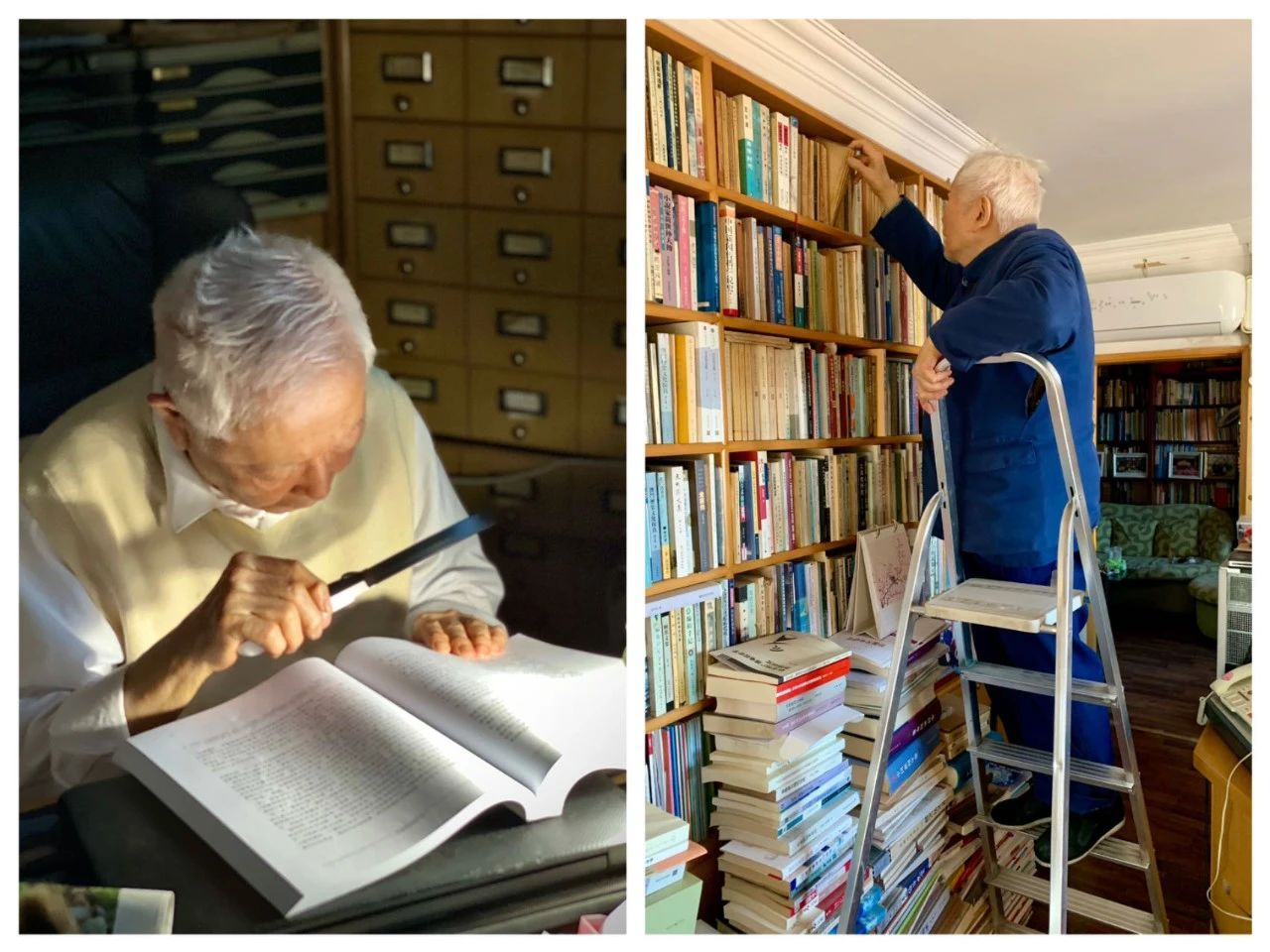右图:2022年2月19日方汉奇身手矫健地爬梯找书(周航屹摄)