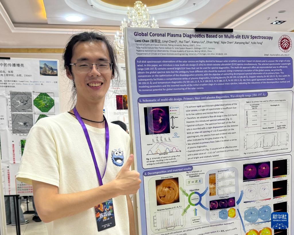 ??北京大学地球与空间科学学院澳门学生陈霖谊与他的论文海报合影(2024年8月摄)。 新华社发