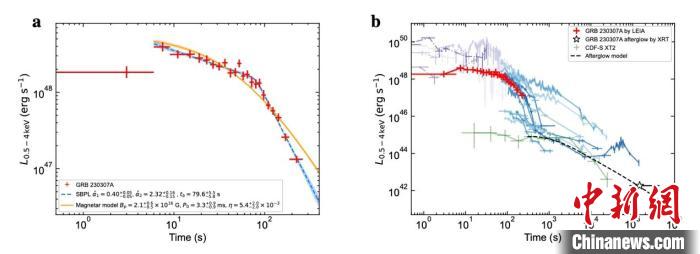 本次研究成果论文中GRB 230307A的X射线光变曲线以及磁陀星作为中心引擎的模型拟合示意图。中国科学院国家天文台 供图
