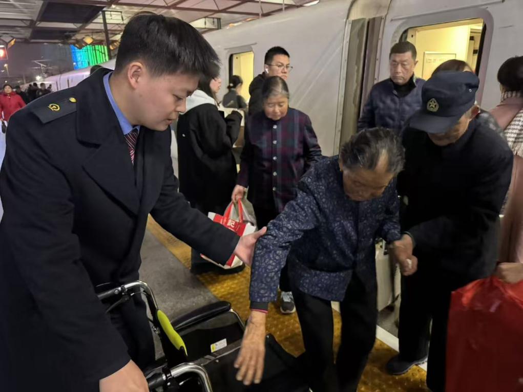 ??图为1月18日,苏州站铁路工作人员为进城高龄老人提供暖心到站接车服务。新华社发 马骁摄