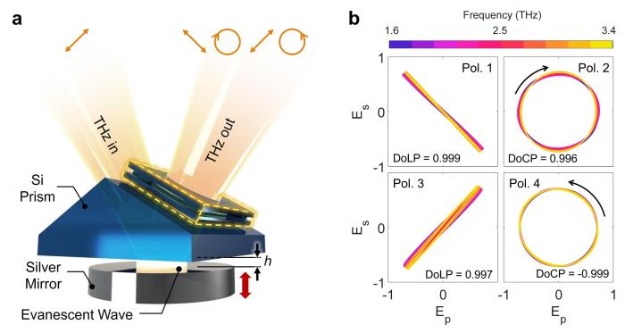 太赫兹多功能宽带偏振调制器。(a)为器件结构示意图;(b)为实验测得的四种偏振态输出。中国科学院空天院 供图