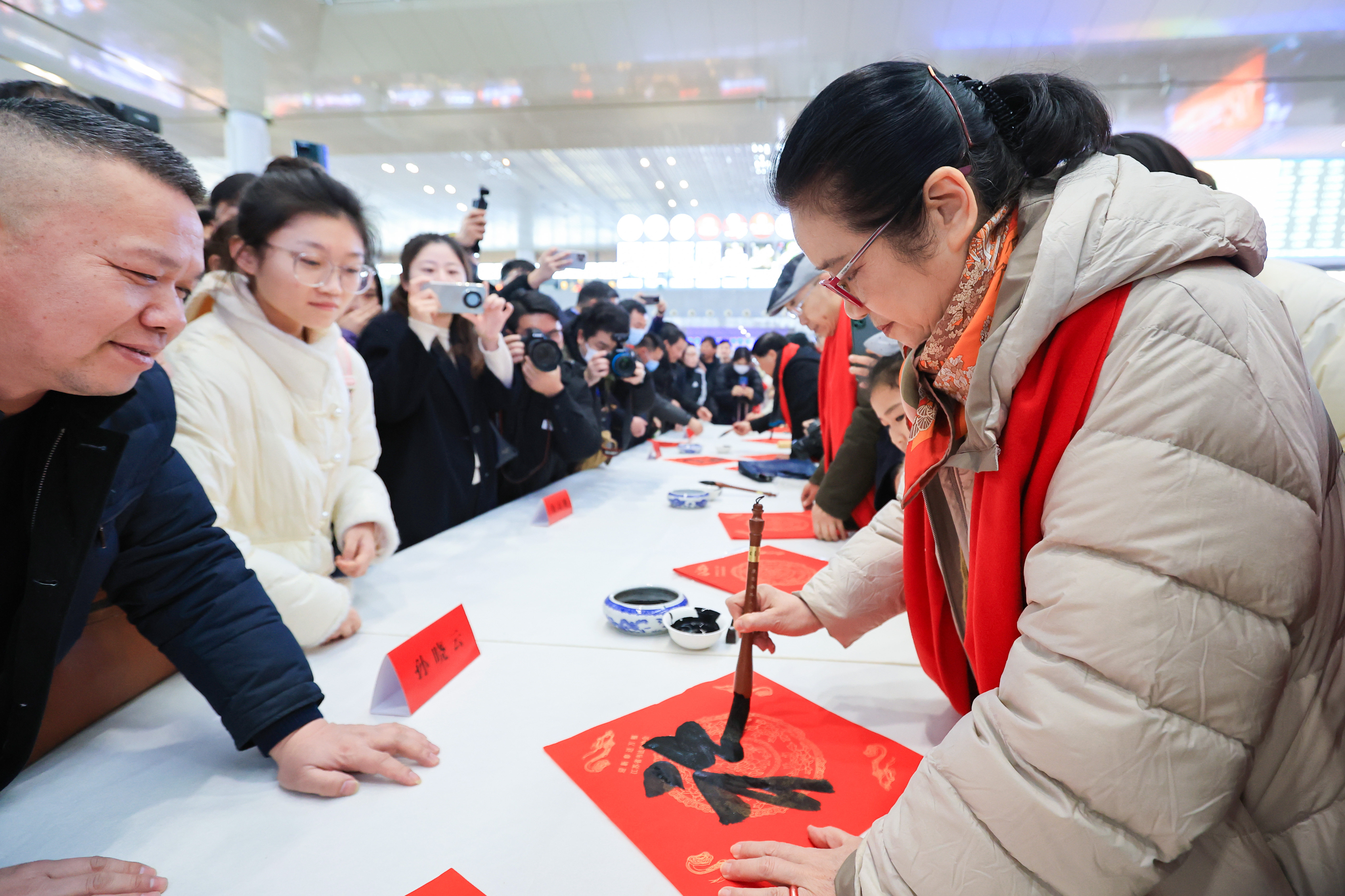 2024年1月26日,书法家孙晓云在凯发k8官网南站候车厅为旅客写“福”字。苏阳摄