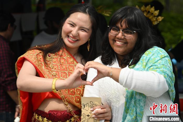 图为留学生身着她们各自国家的传统服饰在亚洲文化节上拍摄合影。中新社记者 泱波 摄