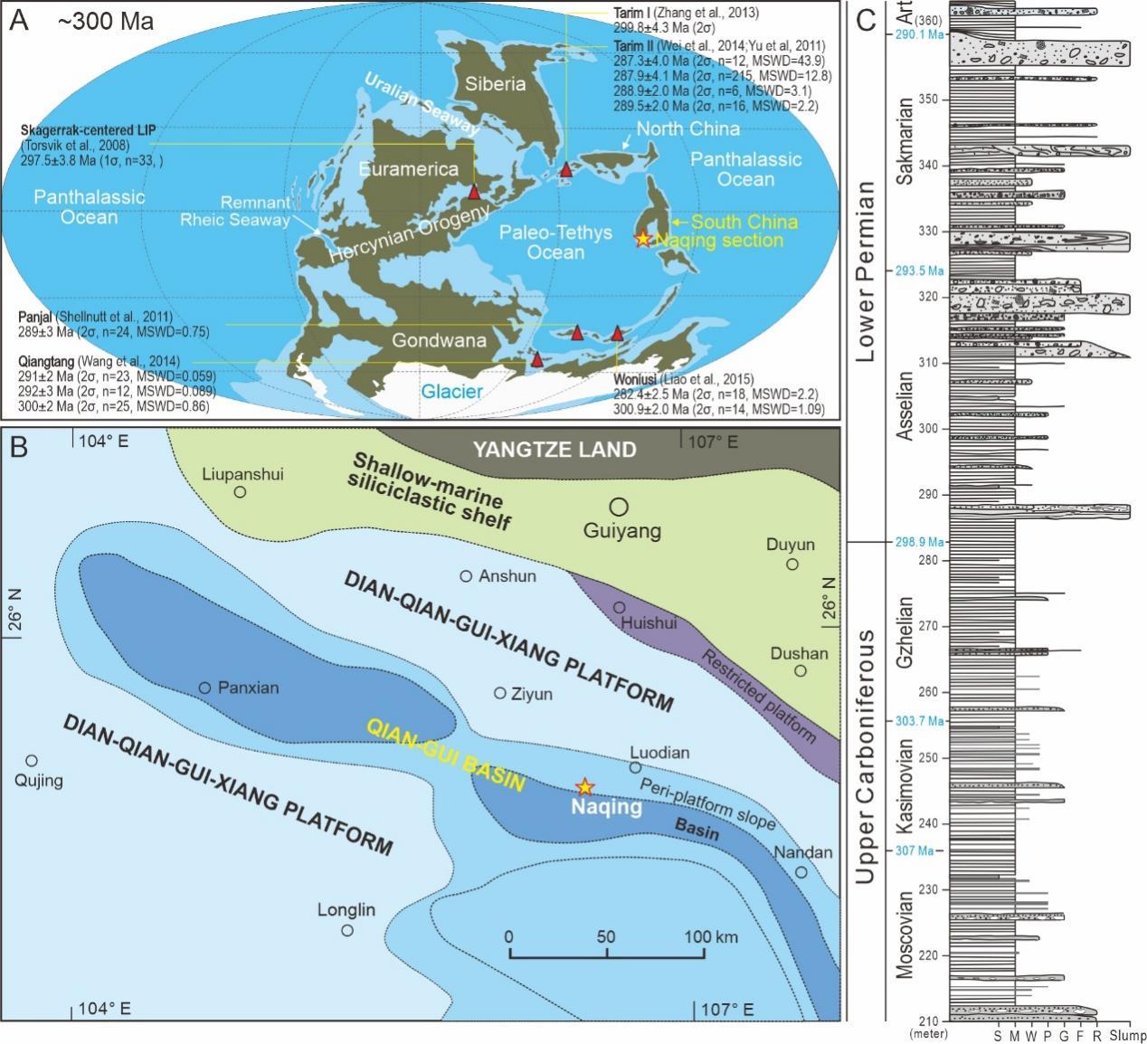 △石炭–二叠纪之交古地理与华南罗甸盆地纳庆剖面柱状图。