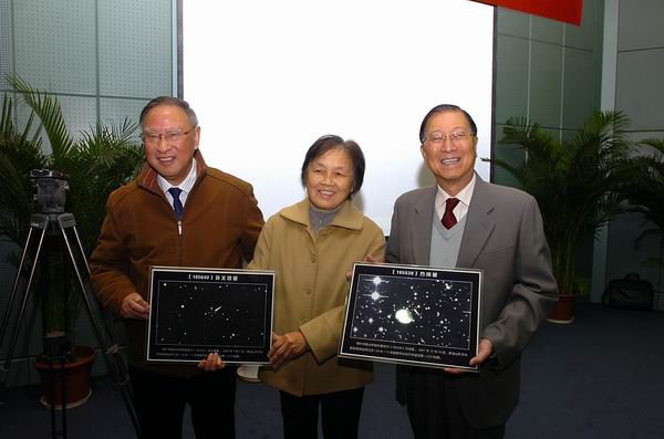 中科院紫金山天文台小行星发现者代表汪琦向两位院士赠送用紫金山天文台盱眙观测站近地天体望远镜拍摄的两颗小行星照片。