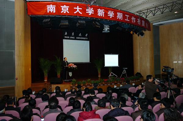 2月28下午,科技馆报告厅内座无虚席,师生代表济济一堂,听取党委书记洪银兴、校长陈骏分别代表党委和行政布置新学期工作要点。大会由常务副校长张荣主持。