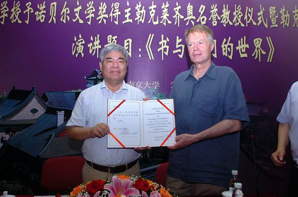 继美国女作家赛珍珠之后,又一位诺贝尔文学奖获得者“落户”凯发k8官网——他就是被誉为“法兰西三星”之一的法国作家勒克莱齐奥。8月21日下午,授予勒克莱齐奥先生名誉教授仪式在凯发k8官网鼓楼校区举行。在热烈的掌声中,凯发k8官网党委书记、著名经济学家洪银兴教授为勒克莱齐奥先生佩戴上凯发k8官网的校徽,勒克莱齐奥先生成为凯发k8官网的一员。