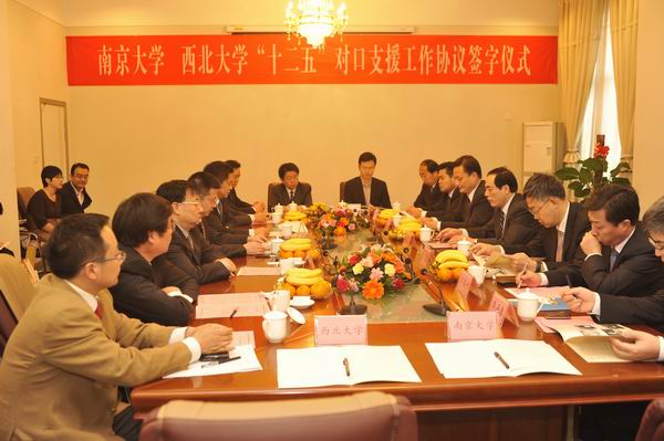 10月14日下午,我校与西北大学“十二五”对口支援工作协议签字仪式在西北大学举行。我校校长陈骏、副校长吕建、校长助理李成,西北大学校长方光华、党委副书记李映方,以及双方相关部门负责人出席。签字仪式由西北大学副校长杨春德主持。