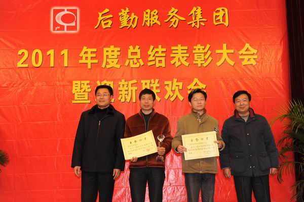 高风华副总经理宣读《后勤服务集团关于表彰2011年度先进集体和先进个人的决定》,薛海林副校长、后勤党委秦志祥书记为后勤服务集团先进集体和先进个人颁奖。