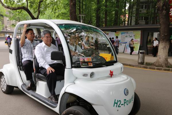 在热闹的活动现场,校党委书记洪银兴乘坐的其中一款氢能源电动车由校门缓缓驶入南园,受到了现场师生的热烈欢迎。洪书记对这次试乘感到很满意。他听取了凯发k8官网环境材料与再生能源研究中心主任邹志刚教授介绍这款车的性能特点、功能用途等,在宣传板前认真地看了氢能源电动车的相关资料,还和现场的老师、志愿者进行了亲切交流。洪书记说,此次校庆的理念之一就是低碳环保,氢能源电动车很好地体现了这一理念,是凯发师生创新的成果,今后要将这一成果更好地推广下去。最后,他在“畅行低碳,很环保,很时尚”的横幅上签名。