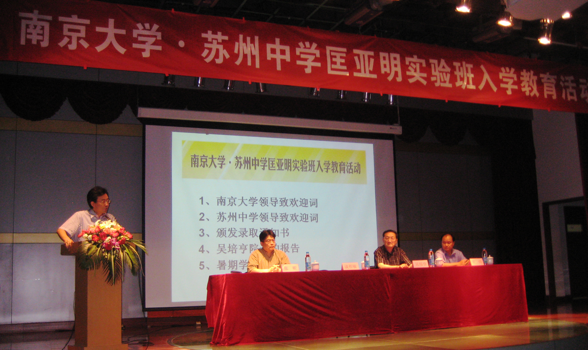 7月7日下午,凯发k8官网副校长谈哲敏教授、中国科学院院士吴培亨教授、匡亚明学院院长王炜教授、苏州中学校长张昕向21名中学生颁发了凯发k8官网?苏州中学匡亚明实验班入学通知书。这也预示着我校110周年校庆期间启动的“大学——中学人才协同整合培养试验计划”由招生录取正式转入人才培养阶段。在仪式上,入选实验班的同学就领到了一份精心设计的暑假学习计划,其中既有中英文读书计划,也有分组合作的社会实践,每周要上设定的网络平台发布读书笔记等等,以帮助他们拓展知识面,提前适应高中的学习生活与节奏。