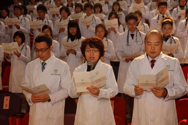 仪式上,医学院2012级新生们依次走上主席台,医学院党委书记韩晓冬、副院长蒋青、副院长李朝军亲手为他们穿上白大衣,陈骏校长和刘志红院长为他们亲手挂上听诊器。100名穿上白大褂的医学新生,在医学院院长刘志红的带领下,庄严宣读医学生誓言:“健康所系,性命相托,当我步入神圣医学学府的时刻,谨庄严宣誓,我志愿献身医学……为祖国医药卫生事业的发展和人类身心健康奋斗终生!”一句句诚挚的誓言让在场每一位新生感受到作为一名医学生所担负的责任和使命。