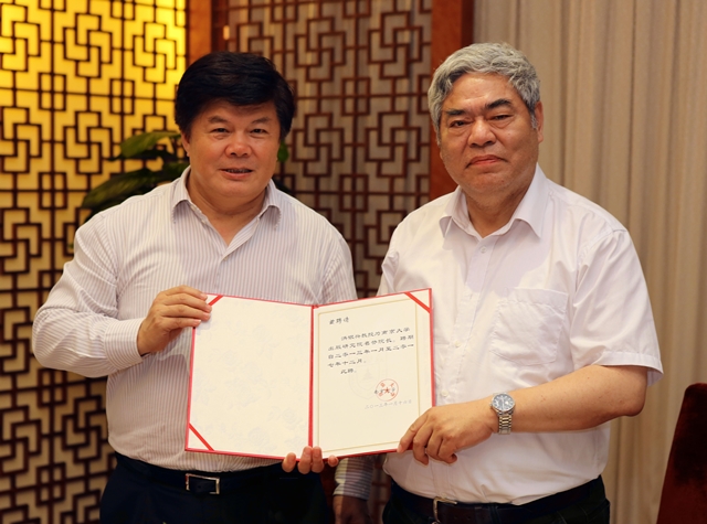 聂震宁院长向洪银兴教授颁发凯发k8官网出版研究院名誉院长聘书。佘治骏 摄