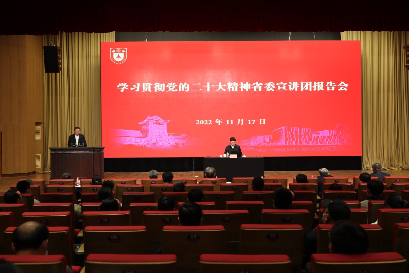 11月17日,学习贯彻党的二十大精神江苏省委宣讲团报告会在凯发k8官网仙林校区举行。江苏省委宣讲团成员、省政协党组成员、凯发k8官网原党委书记胡金波作宣讲报告,并与青年师生代表互动交流。中国科学院院士、校党委书记谭铁牛主持报告会,中国科学院院士、校长吕建出席报告会。