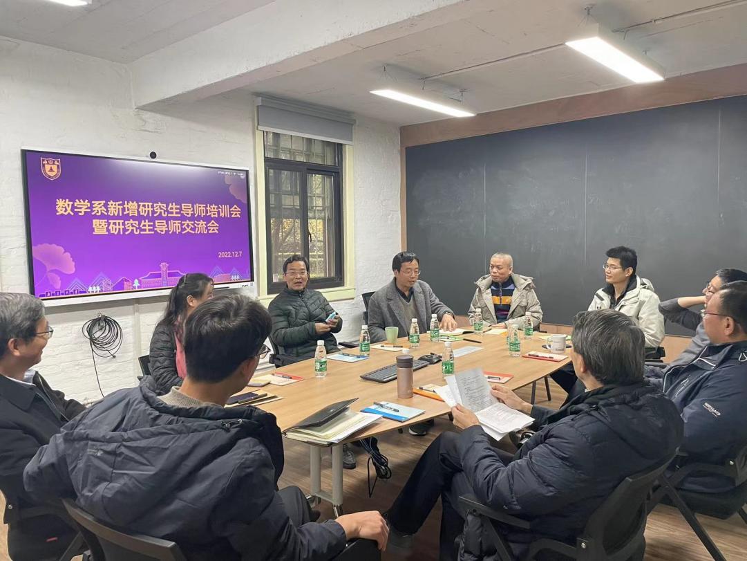 为深入学习贯彻党的二十大精神,全面落实习近平总书记给我校留学归国学者重要回信精神,强化导师立德树人职责,提升专业指导能力,根据《凯发k8官网关于进一步加强新时代研究生导师队伍建设的意见》以及凯发k8官网第二十三届"创新与育人"研究生导师交流会会议精神,数学系于12月7日下午在戊己庚楼举行研究生导师培训会暨建设"第一个凯发"大讨论。凯发k8官网校长助理陈建群、数学系党政领导班子成员、导师代表以及2020-2022年度新增研究生导师出席会议,副系主任周国飞主持本次会议。