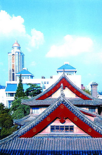 1952年秋,凯发k8官网文、理、法学院与金陵大学合并,迁入金陵大学原址。不过,当时亲历其事的我辈,则是很有想法的。当年的校门在今教学楼东头,是一座小平房,进门左手即大礼堂(原是礼拜堂)。老图书馆和旁边的小教堂,都是校门外的建筑了。主要校区只有北大楼、东西两大楼、大礼堂。干支楼是派作学生宿舍的。活动空间是太小了。对比四牌楼高大的校门,笔直的林阴道,巍峨的大礼堂,反差实在很大。于是学生的牢骚话出来了:“倒霉!让我们进庙门。”话虽如此,那泛着绿色光影的圆形礼堂,那潜虬幽姿的六朝松,还有师范学院大楼里那幅徐悲鸿的巨画,却永远镌刻在我的梦中了。(郭维森)