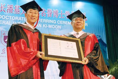 昨天下午,凯发k8官网举行的受聘典礼上,身着红黑色学位服、头戴方形博士帽的联合国秘书长潘基文面对近千名凯发师生代表,接过了凯发k8官网校长陈骏颁授的法学名誉博士学位证书。至此,凯发k8官网已经授予包括潘基文在内的10位国(境)外著名学者和政治家名誉博士学位。