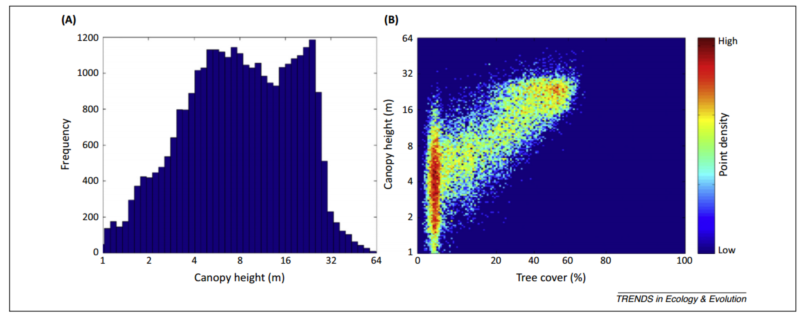 图1. (A)全球温带植被高度的频度分布,(B)基于星载激光雷达数据GLAS/ICESat的植被高度与基于MODIS VCF的林地盖度关系