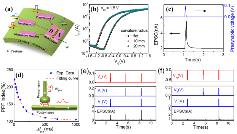 图4. 柔性自支撑壳聚糖耦合的突触/神经元晶体管及其神经仿生特性