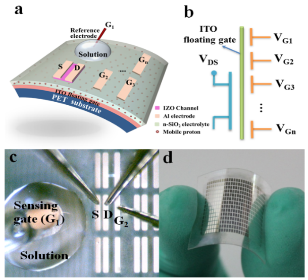 图1.柔性多侧栅神经元晶体管的pH传感器结构示意图及其传感测试照片