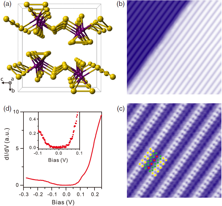 图一:(a) ZrTe5的晶体结构;(b) 4K下获得的ZrTe5表面的台阶形貌,面积为25x25 nm2;(c) ZrTe5表面的原子分辨形貌,面积为8x8 nm2;(d) 在ZrTe5表面获得的局域态密度信息显示100meV的能隙。