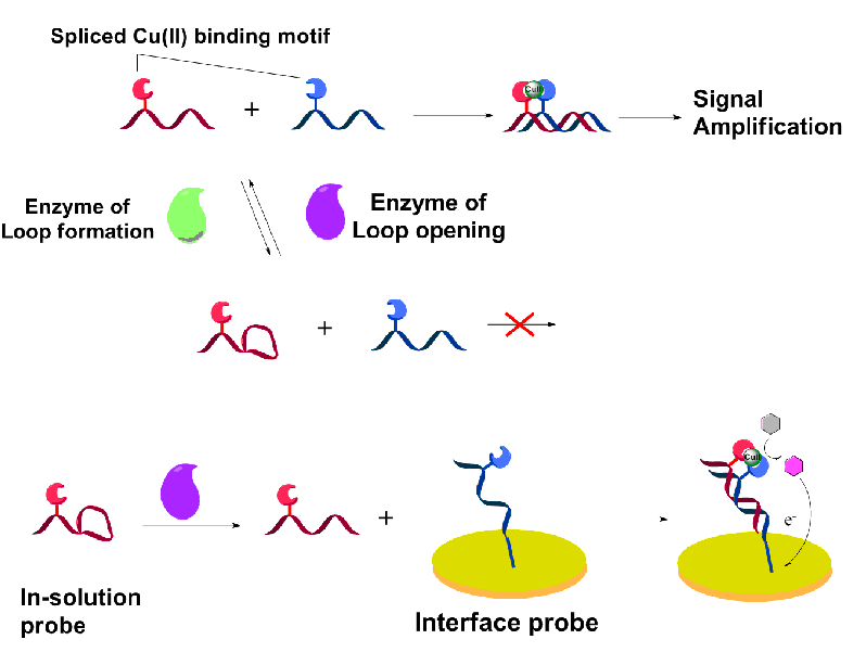 李根喜教授课题组长期从事生物分子工程及临床检测应用方面的研究工作,近期与凯发k8官网医科大学附属第一医院(江苏省人民医院)、附属第二医院、以及凯发k8官网附属鼓楼医院的有关专家合作,在疾病标志蛋白分析新方法及临床检验应用方面取得了系列进展,为临床医学诊断和治疗提供了全新的技术路径。例如,疾病蛋白标志物的发现为相关疾病(如肿瘤、心血管疾病等)的快速、准确诊断带来了新的契机,然而在疾病发生的早期阶段,这些标志物的浓度很低,现有的检测方法往往对此无能为力,为此,李根喜教授课题组利用“DNA步行者”的基本原理,设计了一种全新的电化学生物传感器,可以用于多种临床上常用疾病标志物的灵敏检测。在这一工作中,他们通过设计一种双功能DNA探针,其一端的功能区域可以特异性地识别待测物,另一端的功能区域则能够与电极界面上事先修饰好的信号DNA短链互补配对形成DNA核酶。当待测物存在时,多个双功能DNA探针可以与待测物形成类似于“DNA步行者”的组装体,在邻位效应的帮助下,组装体通过多个双功能DNA探针与电极上信号链的结合,形成完整的核酶切断信号链,而热稳定性的变化促使双功能DNA探针脱离下来,继续结合下一个信号链并将其切割,从而形成有效的放大效应。研究结果证明该检测体系可实现大范围(10-18-10-9 M)和高灵敏度(10-18 M)疾病标志物的检测,为疾病的早期诊断提供了有利的工具,同时,该研究也为利用DNA机器来构建蛋白质电化学检测方法提供了新的设计思路。相关成果以“Simple electrochemical sensing of attomolar protein using fabricated complexes with enhanced surface binding avidity”为题发表于Chemical Science, 2015, 6, 4311-4317。
