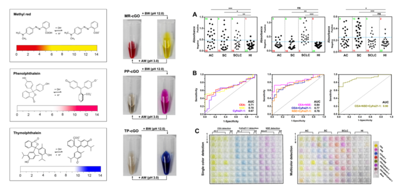 酶联免疫分析是生物医学研究及临床检验中最常用的技术手段,但存在检测信号单一、检测灵敏度较低等问题。李根喜教授课题组首次实现了酶联免疫分析的同时多色检测,极大地弥补了传统酶联免疫测定中效率低下的问题,并且证实了联合分析病人血清中三种肿瘤标志物,可以显著提高肺癌的检出率,为癌症的早期诊断和对症施治提供了非常有益的信息。在这一工作中,他们通过将抗体分子修饰在富含羧基的石墨烯边缘,然后再通过π-π相互作用和疏水作用力将多种变色分子如孔雀石绿、甲基红、酚酞、百里酚酞分别吸附到石墨烯表面,从而制得多种pH响应的变色纳米探针,因此实现了多种肿瘤标志蛋白的多色分析。