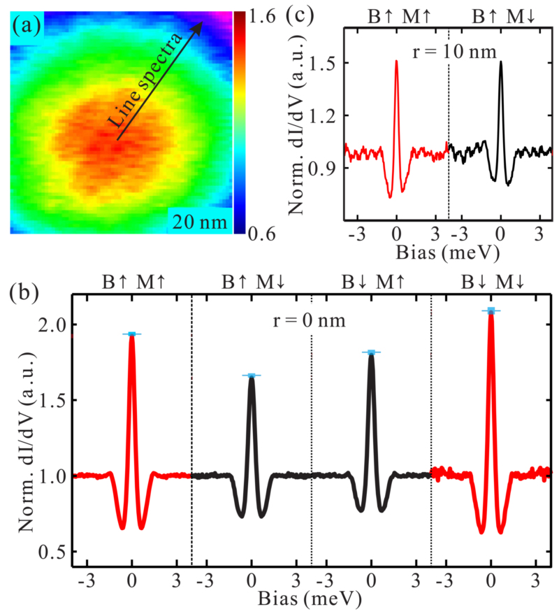 图:(a) 利用非自旋极化针尖,在零偏压下获得的Bi2Te3 / NbSe2表面磁通的dI / dV 空间扫描图;(b) 利用自旋极化的针尖在磁通中心获得的dI / dV曲线,红色为针尖极化平行于磁场,黑色为针尖极化反平行于磁场;(3)利用自旋极化的针尖在远离磁通处测量的dI / dV曲线。