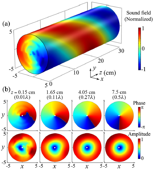 在声学及光学领域中,涡旋场的典型特点表现为沿角度方向螺旋分布的相位,以及对称中心处的零场强,其所携带的轨道角动量(Orbital angular momentum, OAM)通常用拓扑阶数m来表征。近年来对声涡旋场的研究得到了大量的关注,由于所携带声学轨道角动量在众多领域有广泛的应用,包括对粒子的非接触操控等,因而研究声涡旋场的产生与操控机理具有重要的科学意义与应用价值。