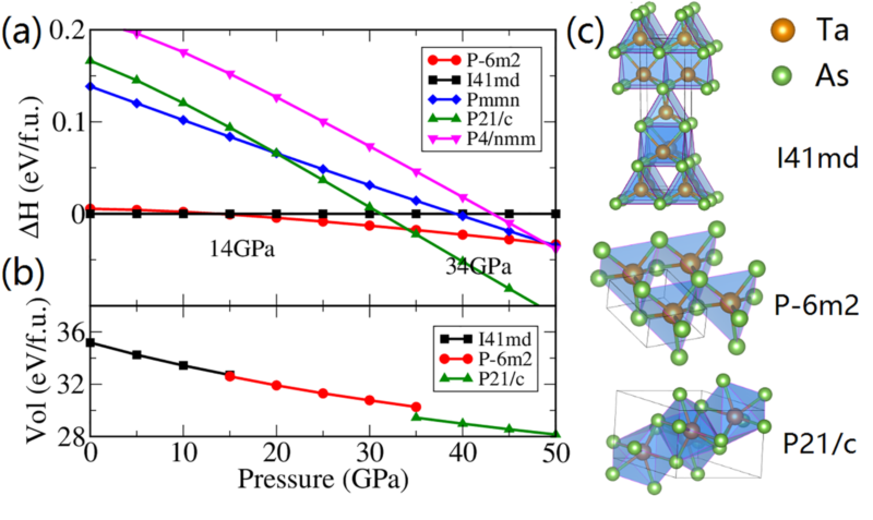 图1 理论预言的TaAs各相的焓值和体积随压力变化的曲线,及其晶体结构。