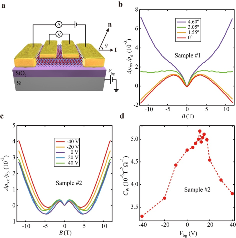 图(a) 薄膜器件结构示意图;(b) 角度敏感的负纵向磁电阻; (c) 背删调节下的负磁阻;(d) 手征反常参量随栅压的变化(CW从c图的磁阻曲线拟合得到),对应费米能调过了外尔点。