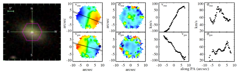 为此,天文学院陈燕梅副教授、施勇教授等利用MaNGA巡天数据首次发现了一批反转的蓝星系。所发现的这批蓝星系为理解外部过程对蓝星系演化的影响提供了重要的观测线索,上图显示了一个反转蓝星系的例子:第一列是SDSS的多色图像,第二列分别是气体和恒星的速度场(红色代表远离地球运动,蓝色代表朝着地球运动,绿色代表运动速度为零),第四列为沿着动力学主轴(第二列中的实线)方向的速度。这些星系的中心区域比其外围具有更多的年轻恒星,暗示这些蓝星系从其外部获得角动量方向相反的气体,这些反转的气体和星系中原有气体相互作用,导致角动量取消,丢失了角动量的气体,极端情况下会自由落体到星系中心,大量气体在中心聚集,触发中心新恒星的诞生,导致星系中心区域的快速增长。而上述物理过程可能是星系中心增长一种新机制。
