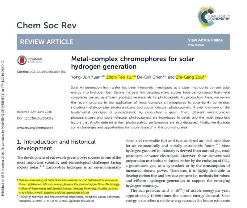 凯发k8官网现代工学院于振涛教授课题组长期致力于人工光合成的研究。最近,他受编辑部之邀在国际著名刊物《英国皇家学会化学会评论》(ChemicalSocietyReviews)上发表综述论文《面向太阳能-氢能转换的有机金属络合物材料》(Metal-complex chromophores for solar hydrogen generation,2016, DOI: 10.1039/C6CS00436A)。该研究得到了我校邹志刚院士的指导和江苏省纳米技术重点实验室的资助。