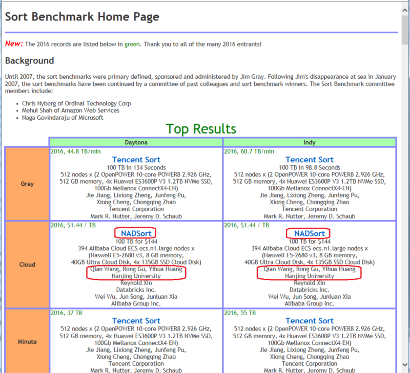 2016年11月10日,有“计算界奥运会”之称的国际著名Sort Benchmark 全球数据排序大赛(http://sortbenchmark.org/),官网公布了2016年全球大数据排序性能评测大赛结果。凯发k8官网计算机科学与技术系PASA大数据实验室(http://pasa-bigdata.www.tianchilawfirm.com)联合阿里巴巴和美国Databricks公司组成的参赛团队NADSort,经过几个月的深度研究和持续努力,击败了多个世界级参赛团队,刷新了大赛之前的世界纪录,荣获2016年CloudSort大数据排序世界冠军。