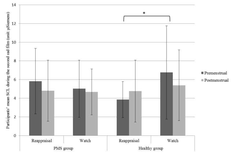 在此基础上,研究者进一步考察了PMS女性和健康女性在自发情绪调节和受指导的情绪调节上的差异。首先让被试自然地观看一段悲伤情绪视频而不进行情绪调节指导,考察两组女性自发情绪调节策略使用的差异;随后,研究者将两组女性随机分配到重评组和观看组,重评组指导被试使用认知重评策略来调节自身情绪,观看组仍不予指导。结果发现,PMS女性更容易受到自发使用表达抑制这种不适应的情绪调节策略所带来的不良影响,而在被要求使用认知重评这种适应性的调节策略时又不能从中获益。