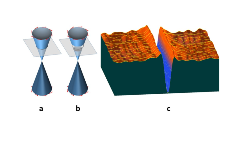 图1. (a)显示的是狄拉克电子色散关系,平面为费米面;(b)显示的是狄拉克电子变成库玻对以后在费米面附近形成的超导能隙;(c)是根据加磁场后扫描隧道谱在空间变化的实验数据所画出来的示意图。实验数据表明,在能隙外,态密度剧烈振荡,形成波澜起伏的状态,显示狄拉克电子在磁场中形成朗道能级效应。由于空间涨落效应,在不同位置,其振荡起伏的具体能量并不严格一致。然而,到了能隙以内,即图1(c)中显示的深凹槽区域,这种振荡就显著变弱,甚至消失,说明狄拉克电子变成了库玻对并且发生了超导凝聚。