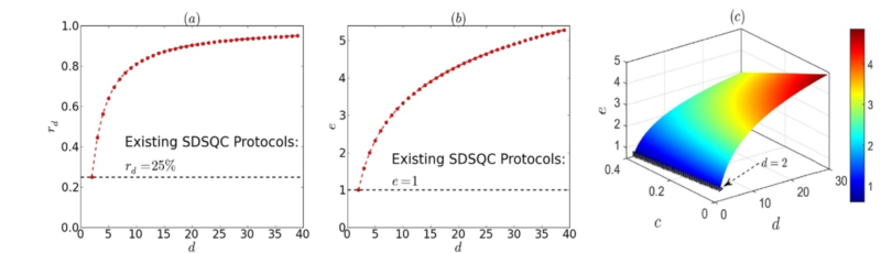 图2. (a) 安全检测效率和维度之间的关系, (b) 传输效率和维度之间的关系,