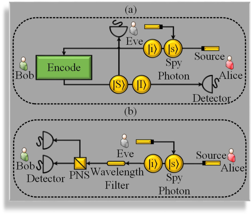 因该类协议需将光子在合法用户间来回传输两次,攻击者Eve可以在Alice发送向Bob的合法信号后插入一个间谍光子,当Bob将信息编码到信号中并发送回Alice时,Eve截取间谍光子,对其测量可以获得Bob编码的信息,这种攻击策略称为量子木马攻击(Trojan Horse Attack)。因间谍光子不会对合法信号造成任何影响,因此Eve可以在不留下任何痕迹的情况下窃取Bob的信息。为防御这种攻击,Bob可以随机选取部分信号,用分束器对其分束然后对两个信号进行测量。如果系统受到Eve的攻击,则多光子率势必会增高,因此可以通过计算多光子率来判断系统是否受到攻击。