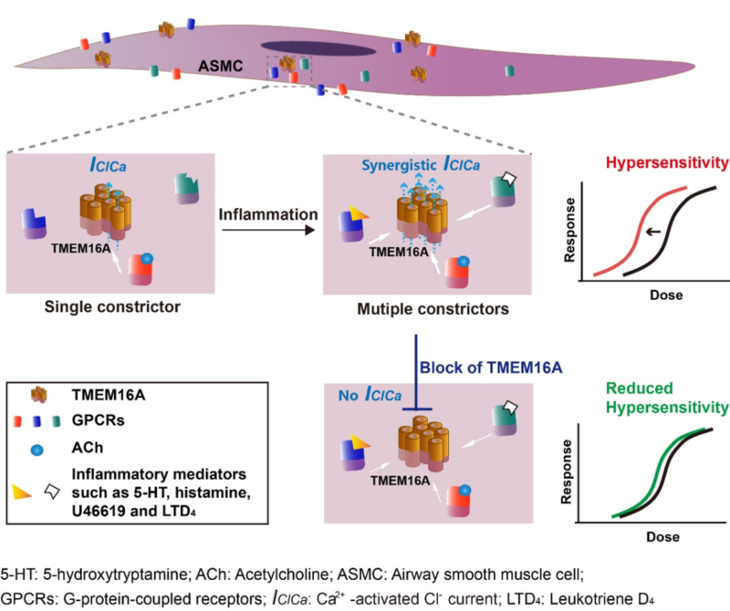 呼吸道对外界刺激的高反应是哮喘发作的病理基础,而过敏反应与该高反应的形成密切相关, 但过敏性反应为什么能引起呼吸道高反应性一直不清楚。在哮喘治疗上,除寻找过敏原、抑制免疫外,尚无其他合适的治疗方法。 该团队研究了过敏性炎症因子(如5-HT、U46619、组胺、LTD4等)介导收缩气道平滑肌的信号通路,首先发现这类因子是通过GPCR、激活TMEM16A氯通道、平滑肌膜去极化途径来完成收缩的。有意思的是,低剂量的神经递质(如乙酰胆碱)也是通过这一途径来调节平滑肌收缩。研究发现,这些炎症因子与神经递质存在有显著的协同效应,其中TMEM16A氯通道是该协同效应的关键分子。通过TMEM16A基因敲除小鼠和TMEM16A特异性抑制剂进行系统地研究发现,抑制该氯通道可以极大地抑制呼吸道高反应性、降低呼吸道阻力、明显改善哮喘症状。目前临床抗哮喘药物主要针对单一炎症因子,无法同时针对多因子进行药物设计。该研究成果可以有效地解决这一问题,因为TMEM16A途径是一个通用途径,设计TMEM16A抑制剂即可有效地抑制多种炎性因子的致病效应,研究人员认为TMEM16A是一个非常理想的哮喘治疗药物靶点。