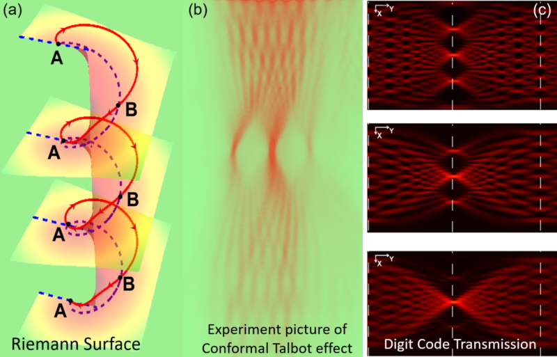 图 (a) 黎曼面上光线的传播;(b) 共形Talbot效应的实验照片; (c) 共形Talbot效应的数字编码功能演示.