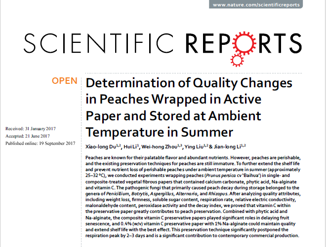 生命科学院李建龙教授实验室在食品安全生态保护领域取得重要实用性成果,他们以张家港凤凰水蜜桃为研究对象,经多年实验室及大田试验与论证后,参考国内外相关重要生理生态指标,结合微生物检验技术与生物工程制备技术,自主研发了可在夏季常温下有效抑制水蜜桃果实采后腐烂、病害发生的维生素C复合保鲜纸,其应用效果显示能有效延长水蜜桃保鲜期和货架期,从而有效解决了水蜜桃采后难于保鲜与贮运关键技术,这一世界难题,为我国今后发展农业食品工业,促进农业发展和农民增收,提高食品安全,提供了关键技术支持与保鲜产品。该成果以“Determination of Quality Changes in Peaches Wrapped in Active Paper and Stored at Ambient Temperature in Summer”(http:// https://www.nature.com/articles/s41598-017-09221-1)为题在《Scientific Reports》发表,第一作者为杜小龙博士,通讯作者为李建龙教授。