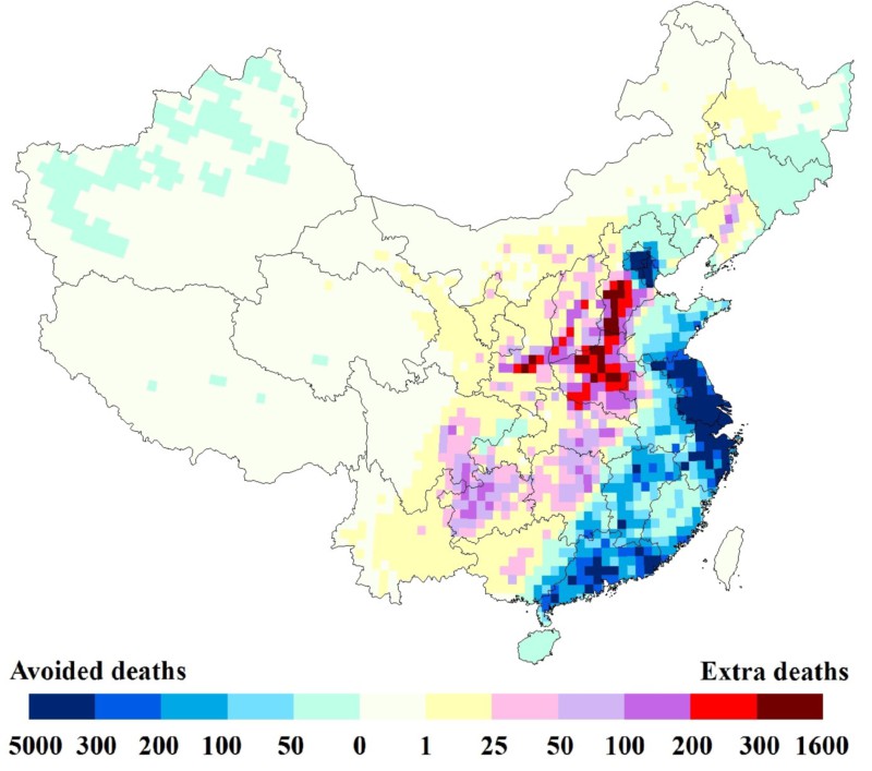 图2. 国际贸易(a)和国内省际间贸易(b)对中国大气污染的健康影响。