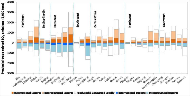 图1. 中国各省基于生产和消费的大气污染物排放。