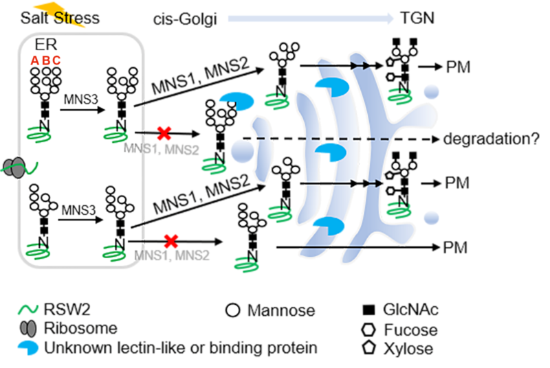 (图1)MNS1/MNS2介导的N-糖基剪切作用调节盐胁迫下RSW2/rsw2-1的稳定性和/或运输机制示意图。C-分支a1,2-甘露糖残基的切除确保了RSW2/rsw2-1向反式高尔基体网络(TGN)和质膜(PM)的成功运输。而MNS1和MNS2功能的缺失使RSW2/rsw2-1蛋白N-糖基的 C-末端携带a1,2-甘露糖残基,其可能被高尔基体中的某些糖结合蛋白识别并被递送至液泡或其他亚细胞结构或在未知的降解机制中进行降解。