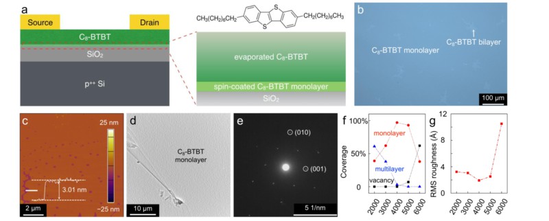 图1. 液相制备的大面积二维单层分子晶态薄膜及其在高性能场效应晶体管中的应用。